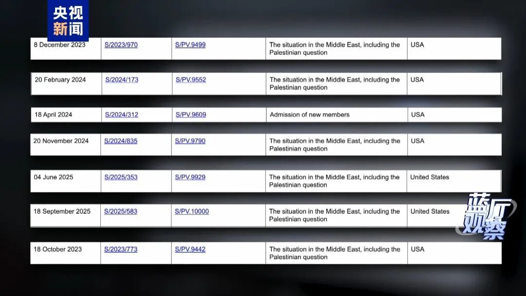 当前,美国是联合国安理会五个常任理事国中唯一未承认巴勒斯坦国的国家。我们查找到的这份联合国研究机构公布的统计显示,自2023年10月至今,美国在安理会共行使了7次“一票否决”权,除一次是针对巴勒斯坦加入联合国的申请外,其余6次都是针对呼吁巴以停火的决议草案。