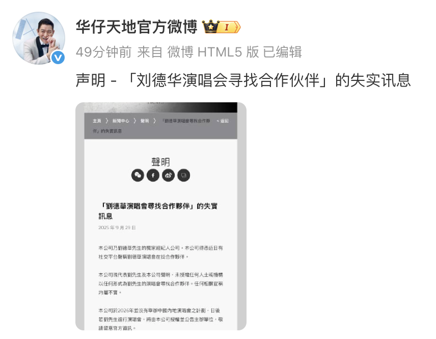 9月26日,据刘德华官方后援会账号,刘德华经纪公司亨泰环宇发布声明利配网,称“刘德华演唱会寻找合作伙伴”系失实讯息。