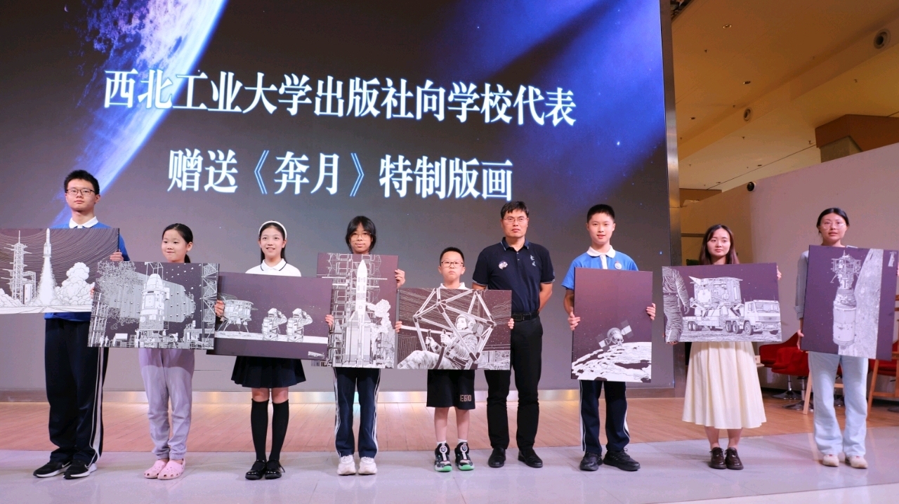 发布会现场还设置了航天知识抢答,吸引现场青少年踊跃参与,再次点燃观众航天热情。西北工业大学出版社向深圳学校代表赠送《奔月》特制版画。
